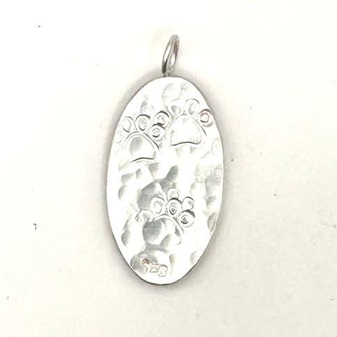 A silver dog silhouette with a tiny 9ct gold dog tag. Textured with paw prints and hammering on the reverse.