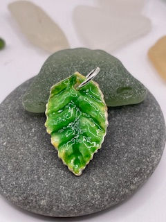 This leaf pendant has layers of beautiful green enamel to catch the light.